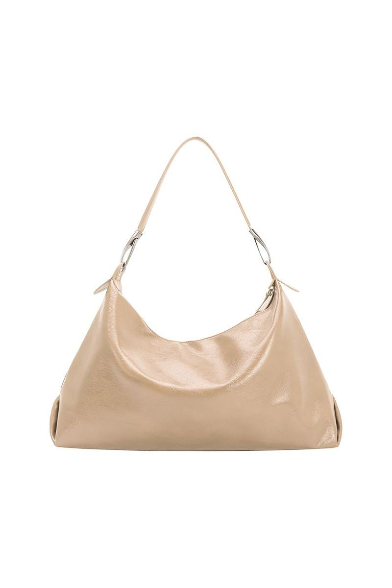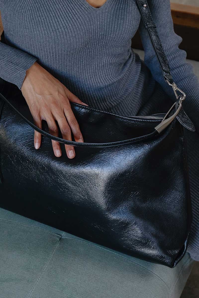 Introducing Charlie, the perfect minimalist handbag made from recycled vegan leather. It boasts a crinkly and shiny appearance. With both crossbody and shoulder straps, it's versatile and stylish. You can fit all your essentials while staying organized in the spacious interior.