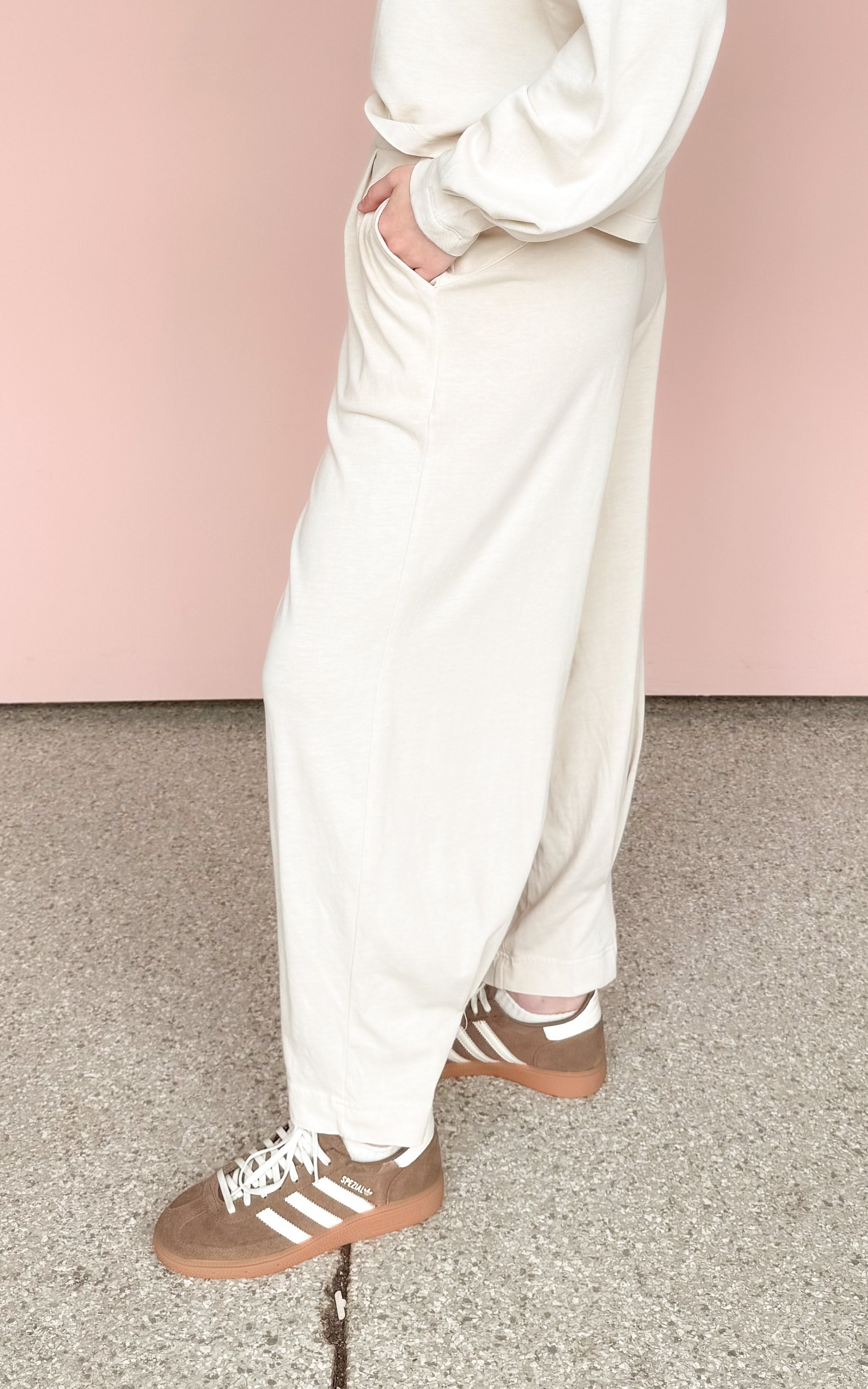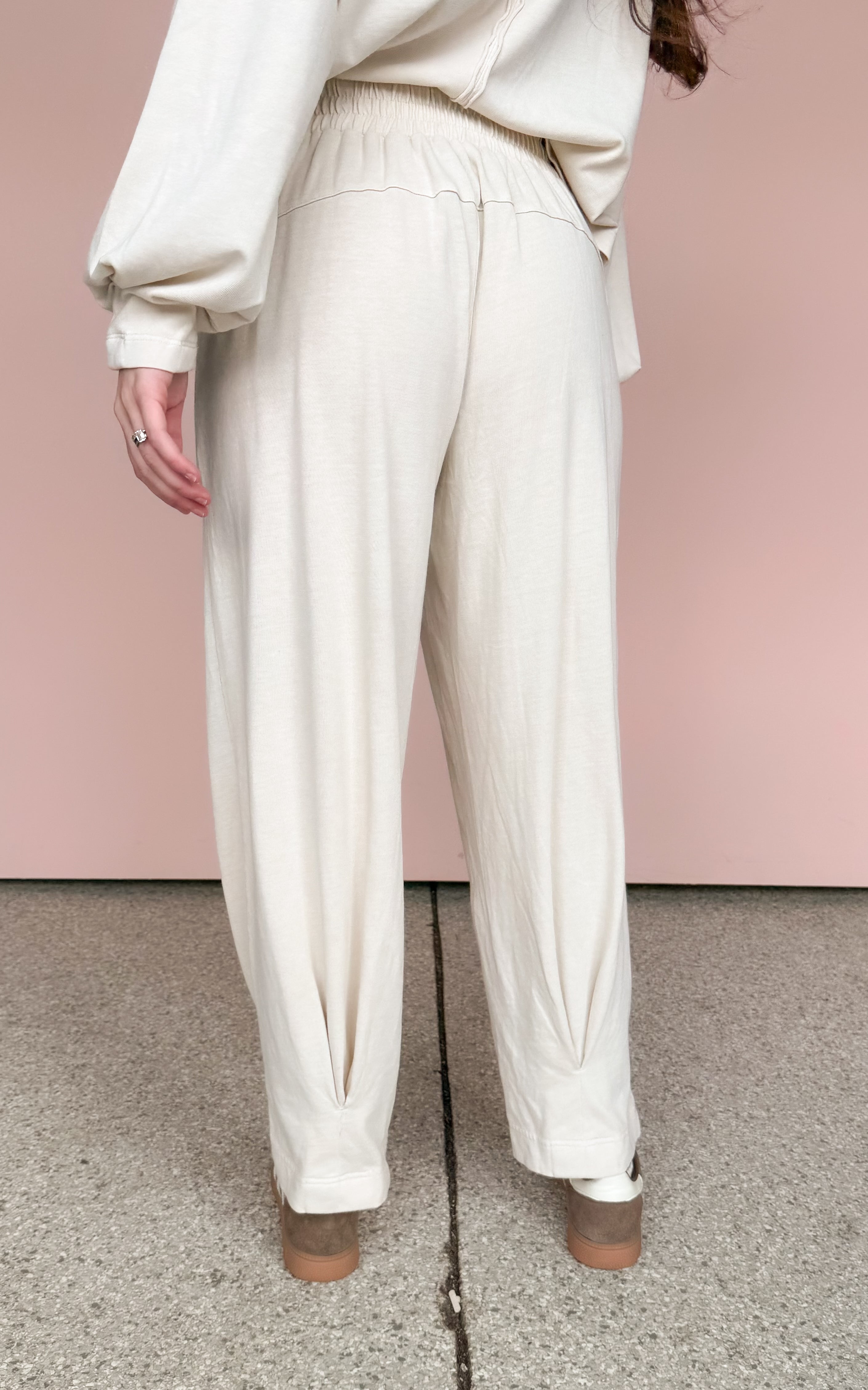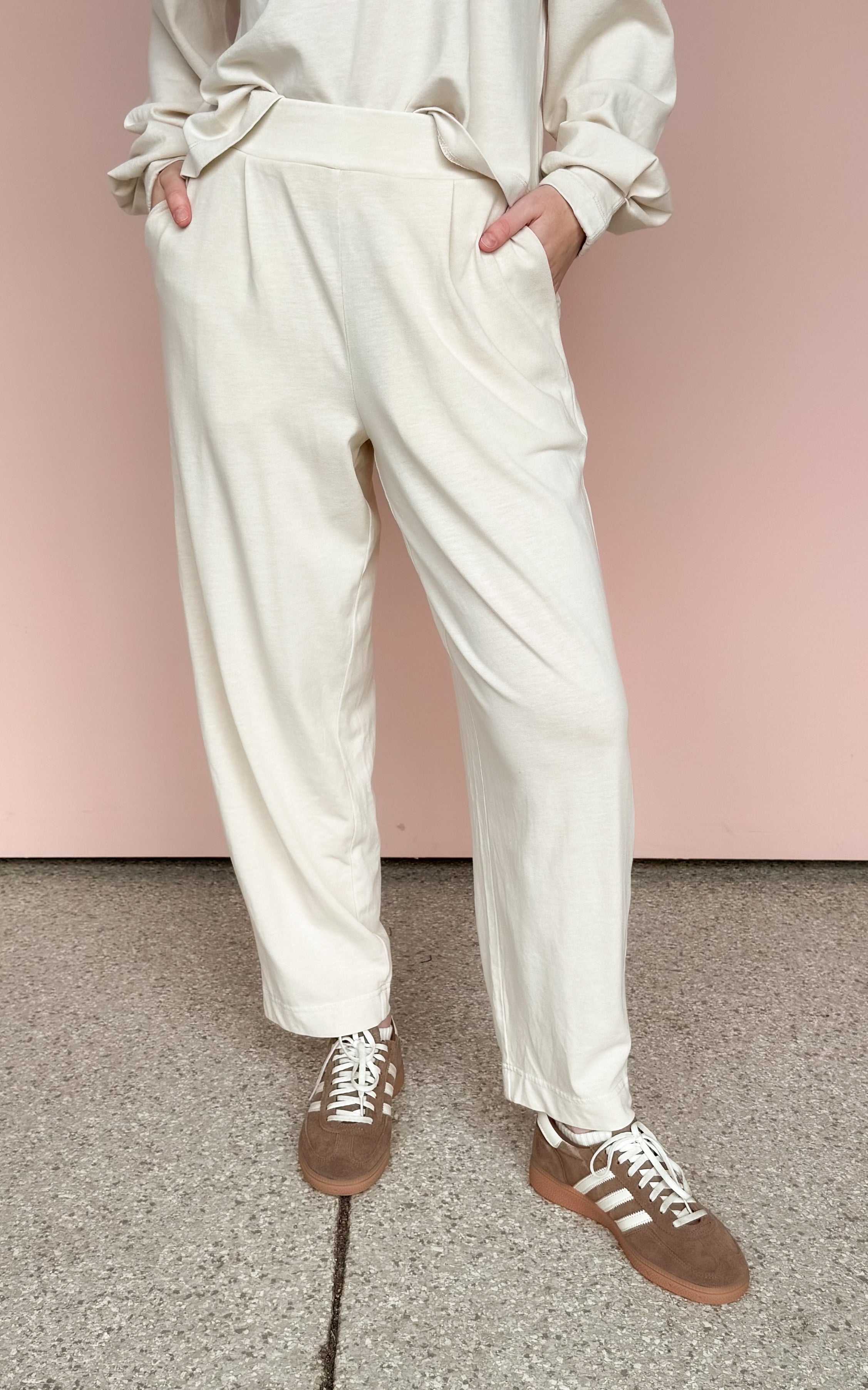 Softly structured and effortlessly relaxed, these mineral-washed cocoon pants bring quiet volume and everyday ease. Designed with subtle pleats, an elastic waistband, and functional side pockets, they strike the perfect balance between comfort and shape. A laid-back silhouette with an artful touch.