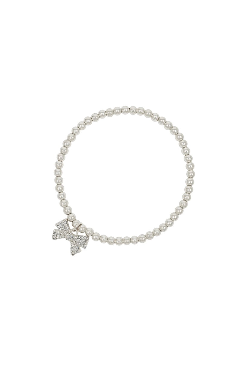 Classic with a touch of sparkle — this silver stretch bracelet features delicate 4mm beads and a shimmering rhinestone bow charm that adds the sweetest finishing touch. Perfect for layering or wearing solo for a hint of everyday shine.