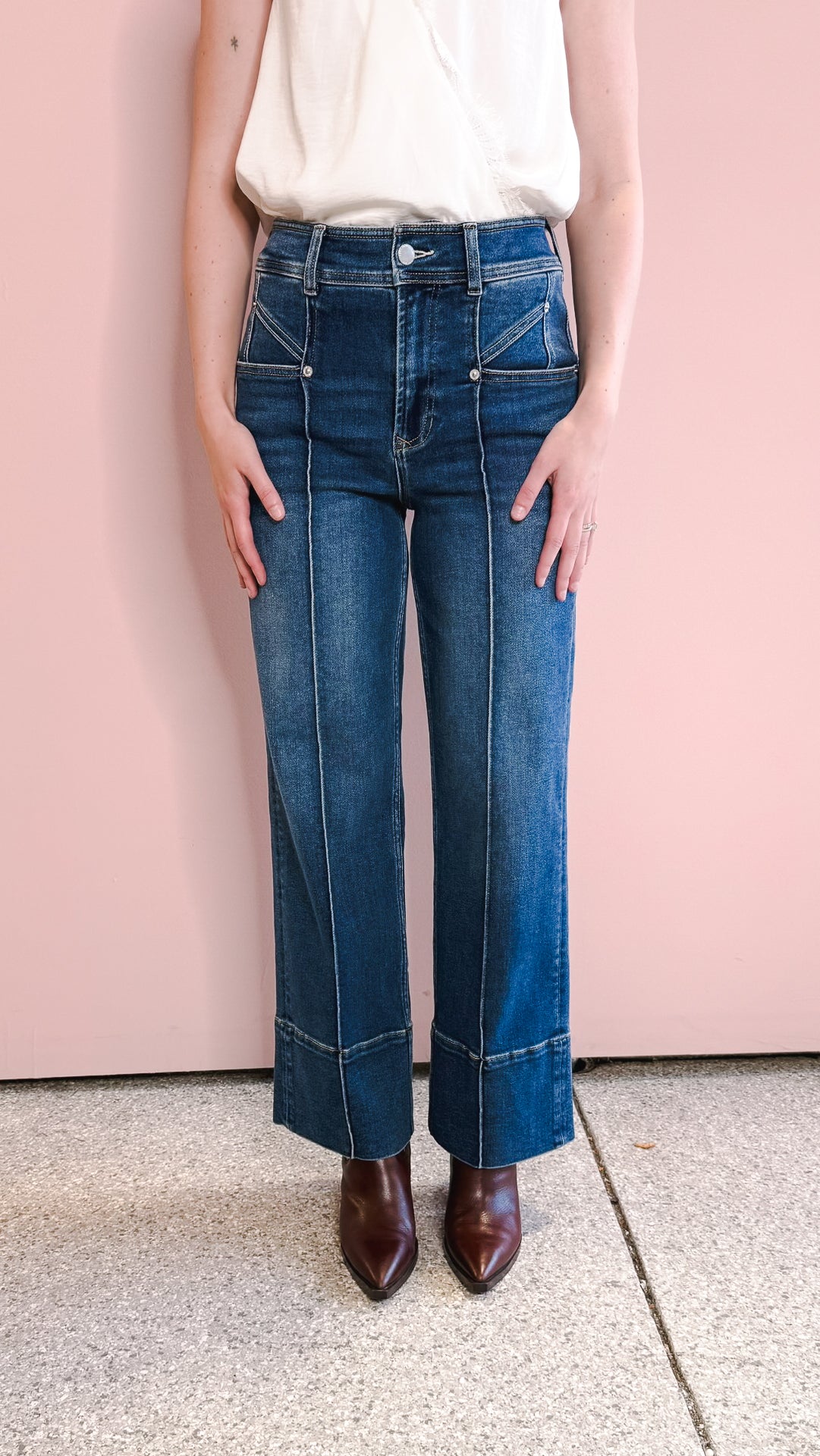Holly straight leg jean in midtown wash, featuring a high rise design and a wide leg band for a sleek look.