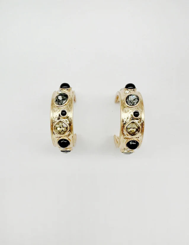 A little bold, a little glam — these hammered gold hoops are the perfect statement piece for any occasion. Featuring a mix of black, grey, and clear crystals, they bring just the right amount of sparkle while keeping a timeless, elegant feel.