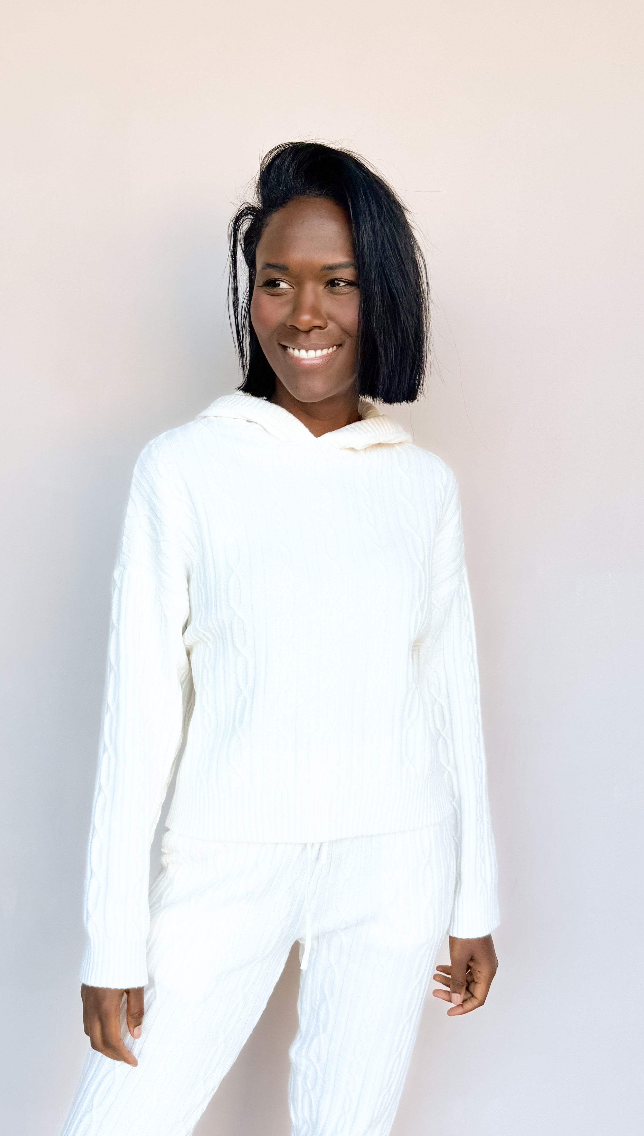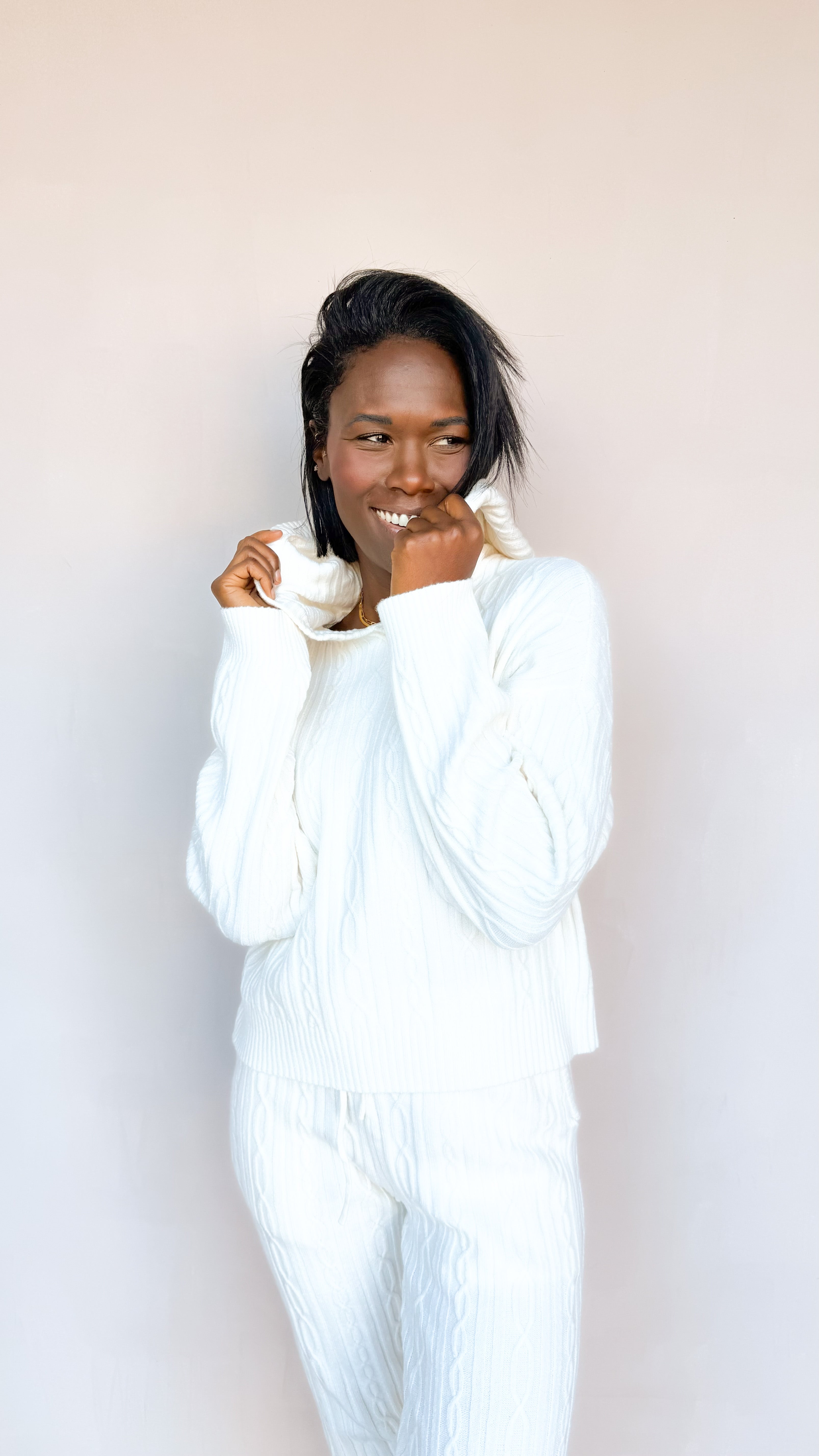 Upgrade your loungewear with this luxuriously cozy Mary Sweater. This elevated sweatshirt features a beautifully intricate cable pattern and a comfortable relaxed fit, making it a stylish and warm piece perfect for a sophisticated monochrome look.