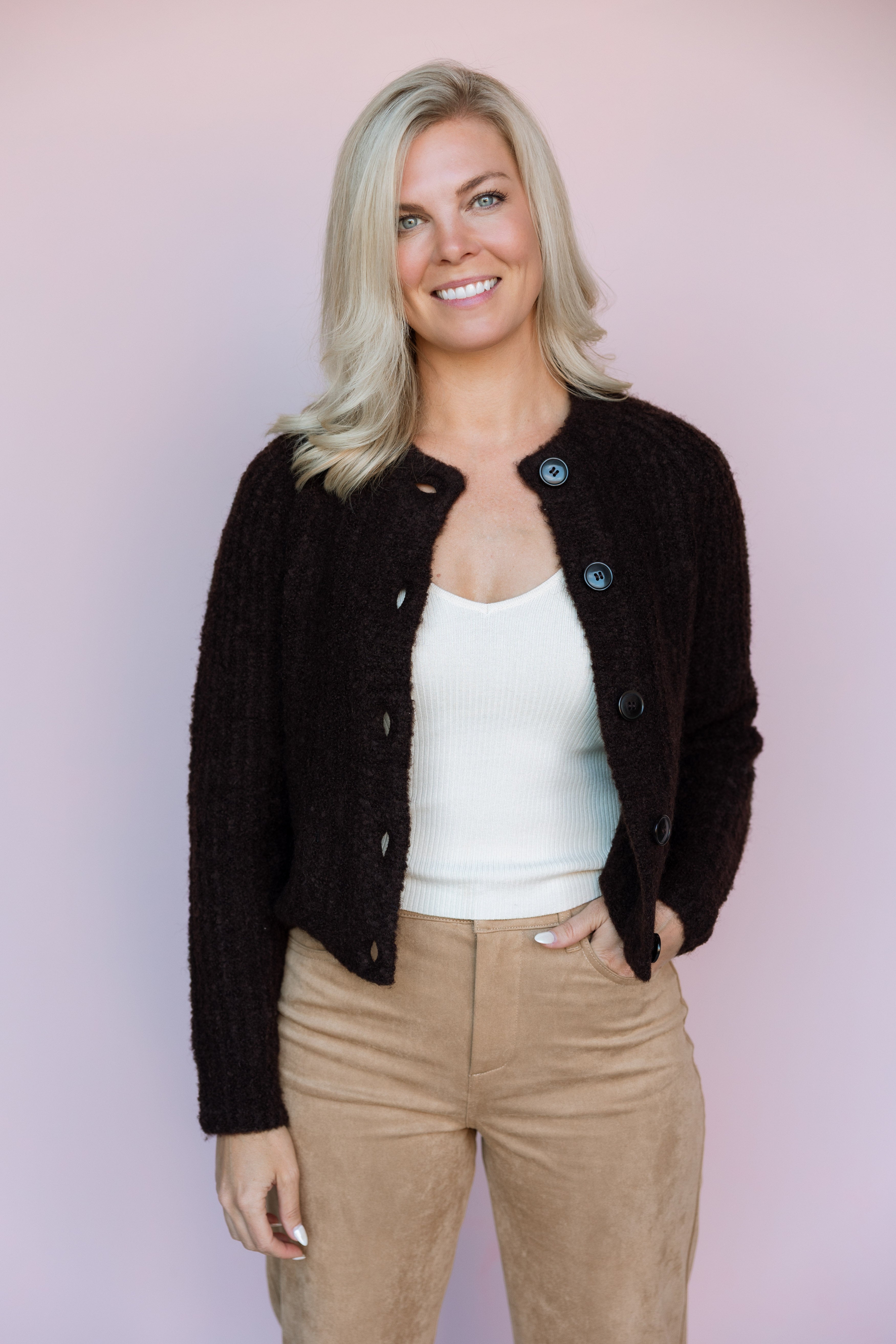 The Carmen Cardigan is your ultimate cozy layering piece for adding texture and warmth to any outfit.