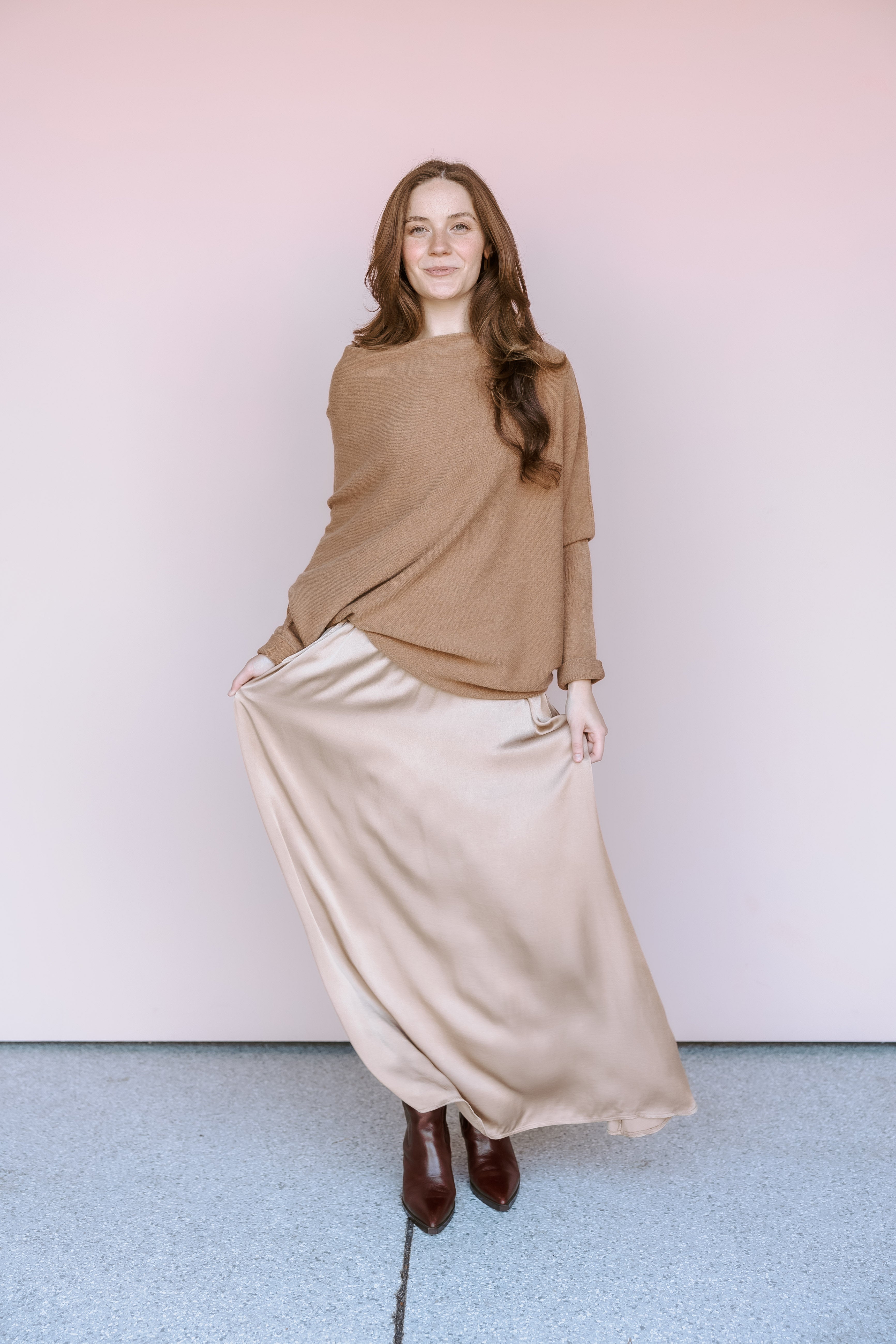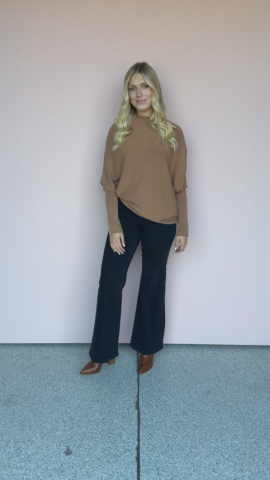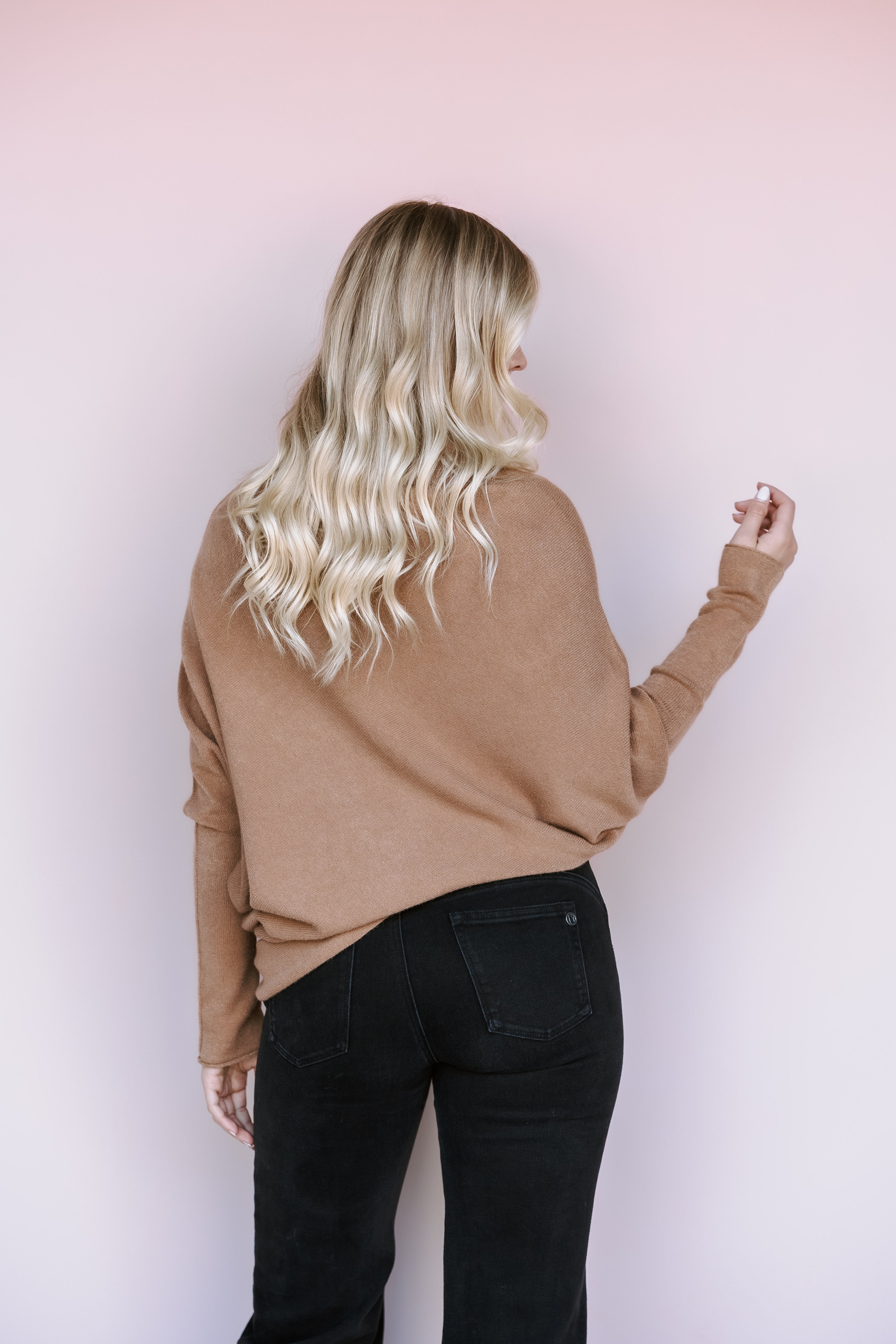 Sink into the luxurious feel of this Camel Asymmetrical sweater. The modern hemline and subtle dolman sleeves make this an effortlessly stylish piece for creating a cozy, monochromatic look.
