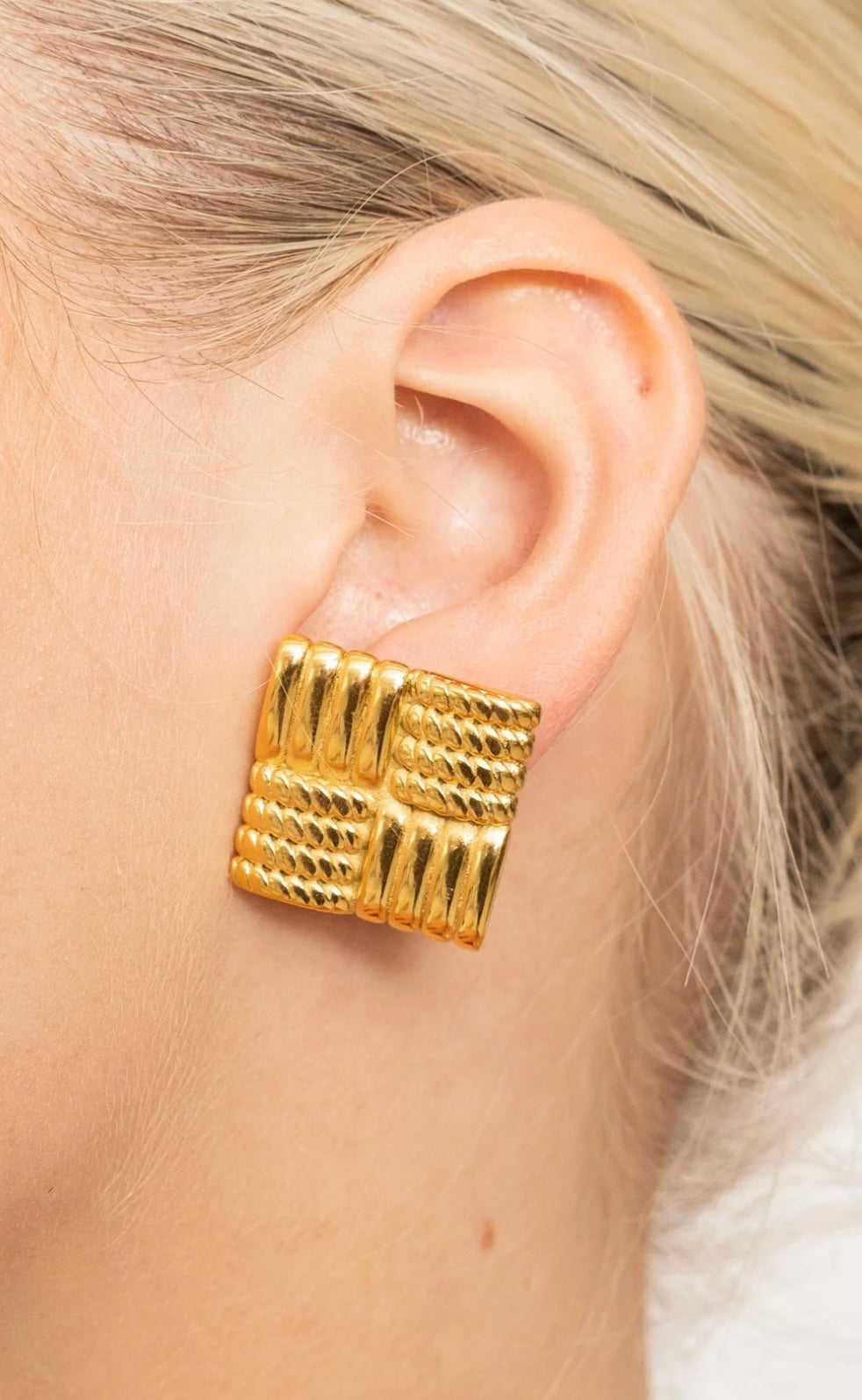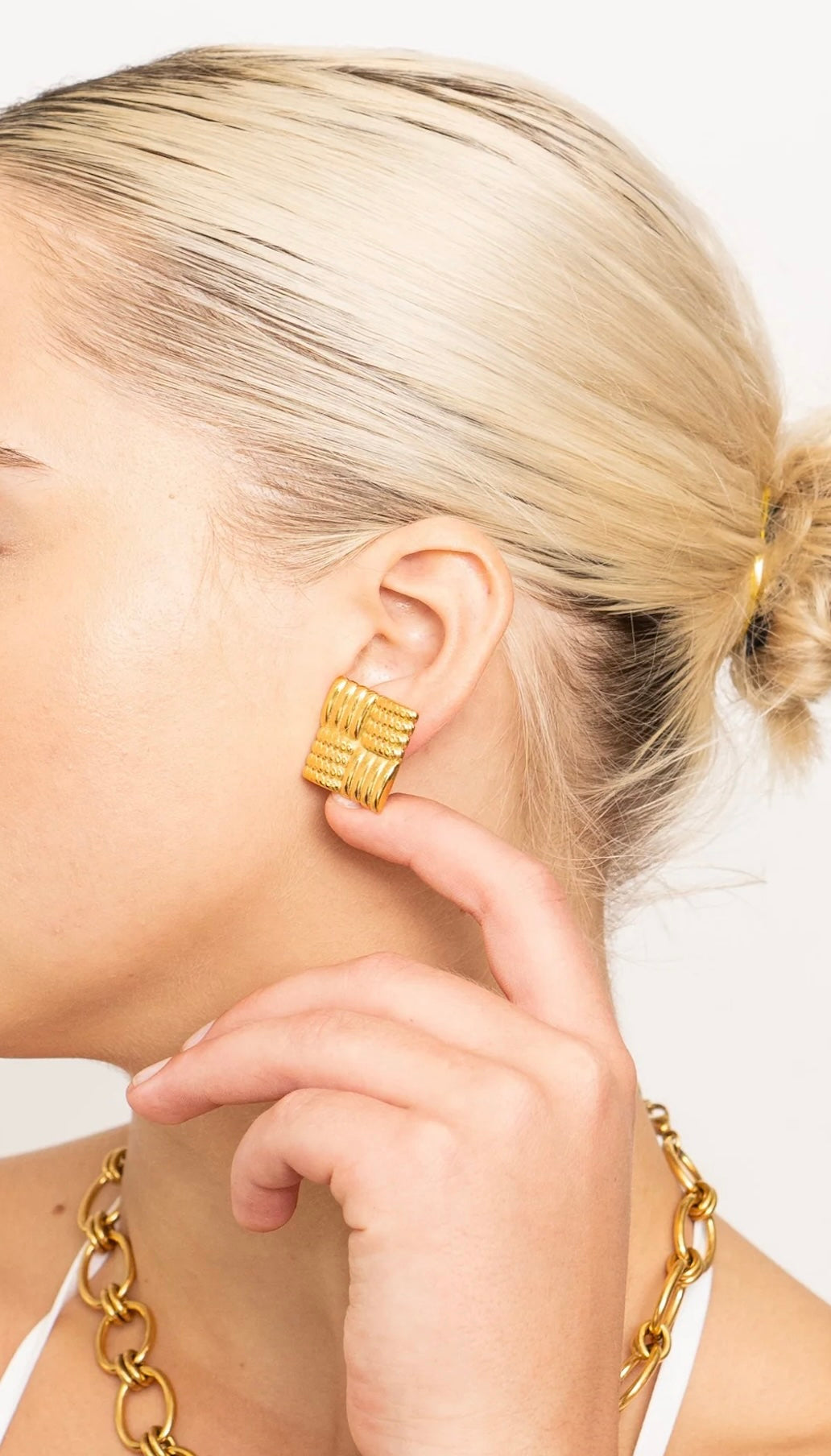 Get squared away with these Aspen studs. Bold and beautiful, they're the ultimate accessory for making a statement. Crafted from waterproof 18K gold-plated stainless steel for long-lasting shine and made in our signature twisted Aspen collection. These beauties are lightweight so you can live in them!