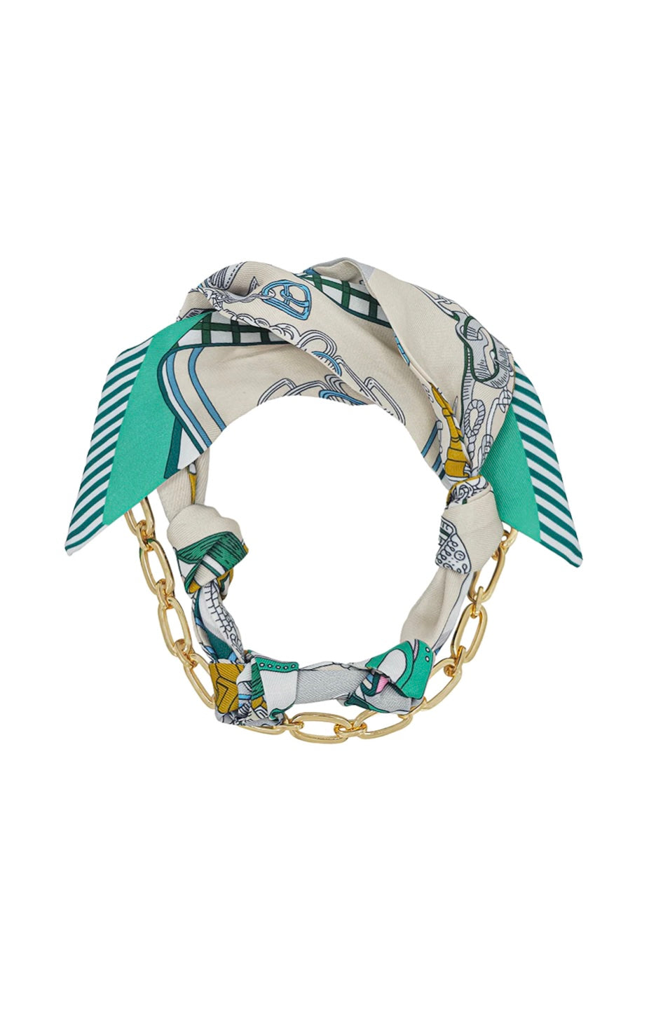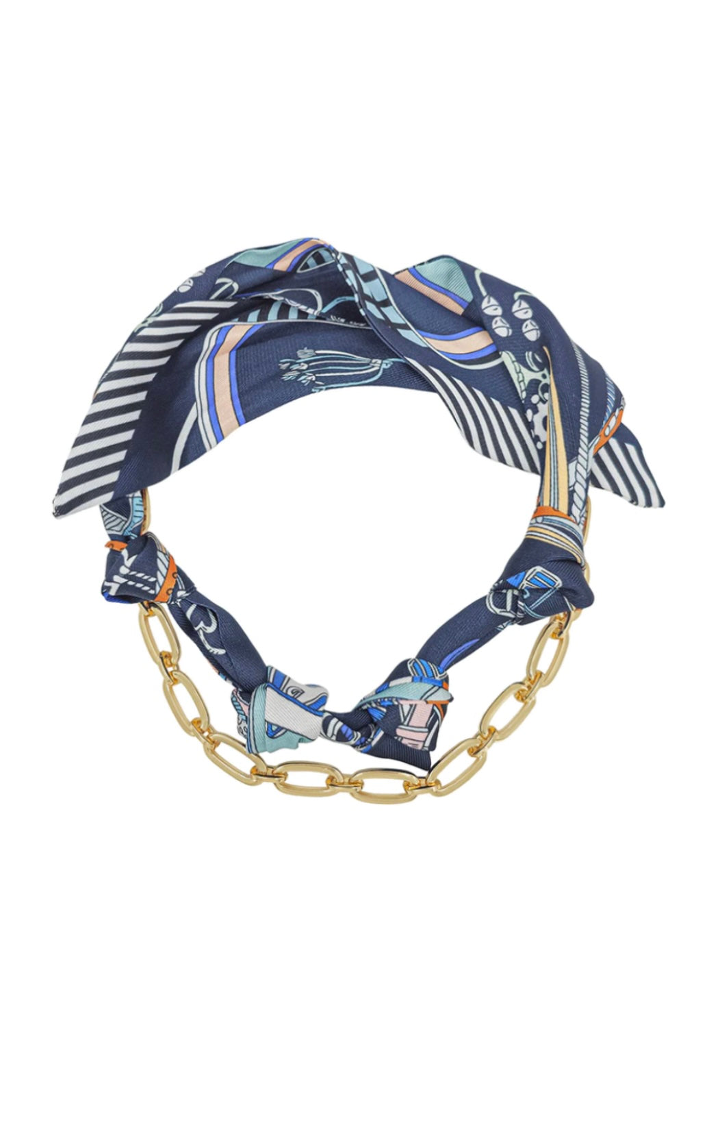 Effortlessly chic and endlessly versatile, this knotted scarf necklace adds a touch of sophistication to any outfit. The silky printed scarf is artfully intertwined with a sleek gold chain for a layered look that’s both modern and classic.