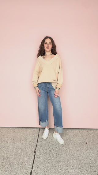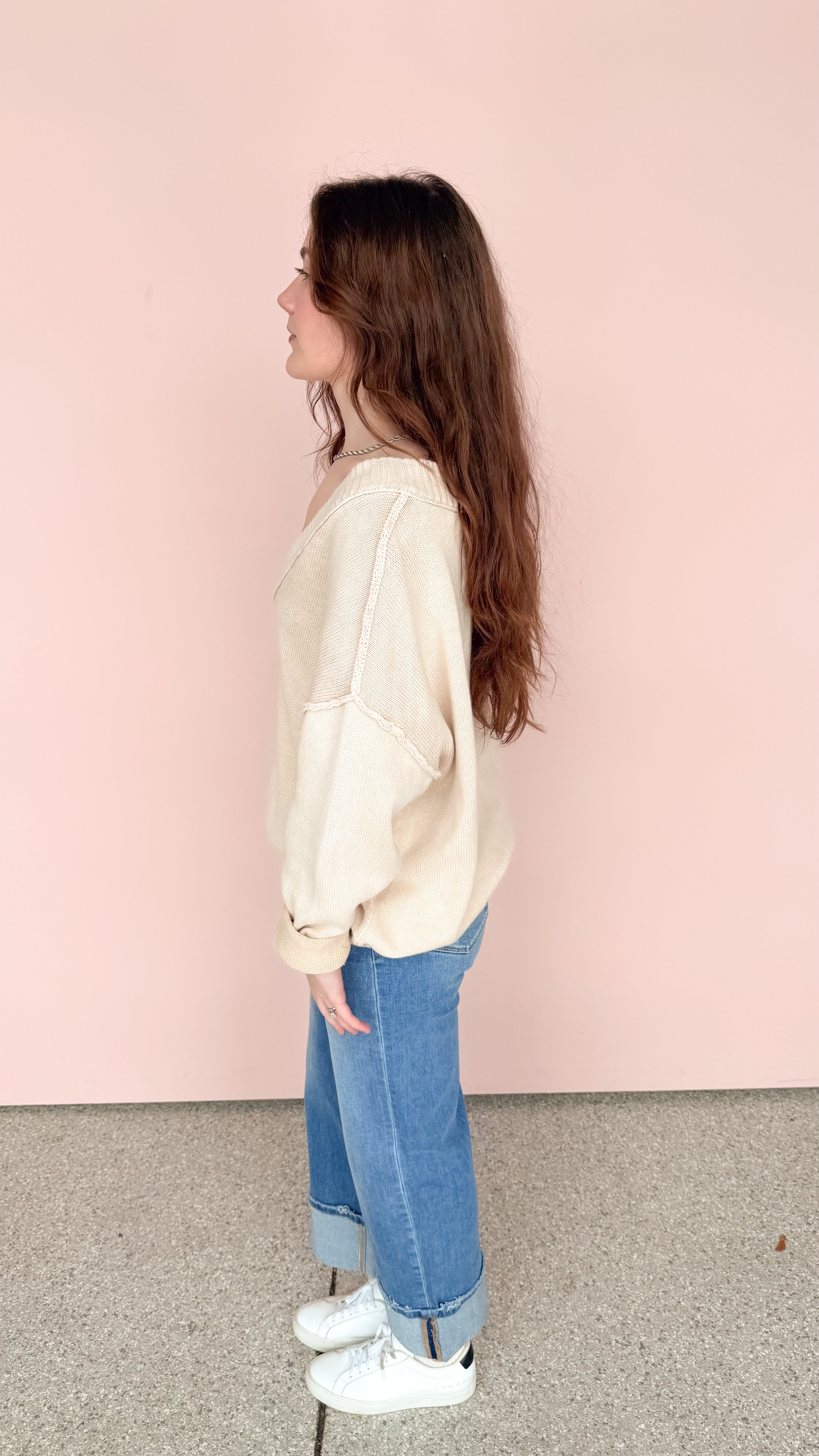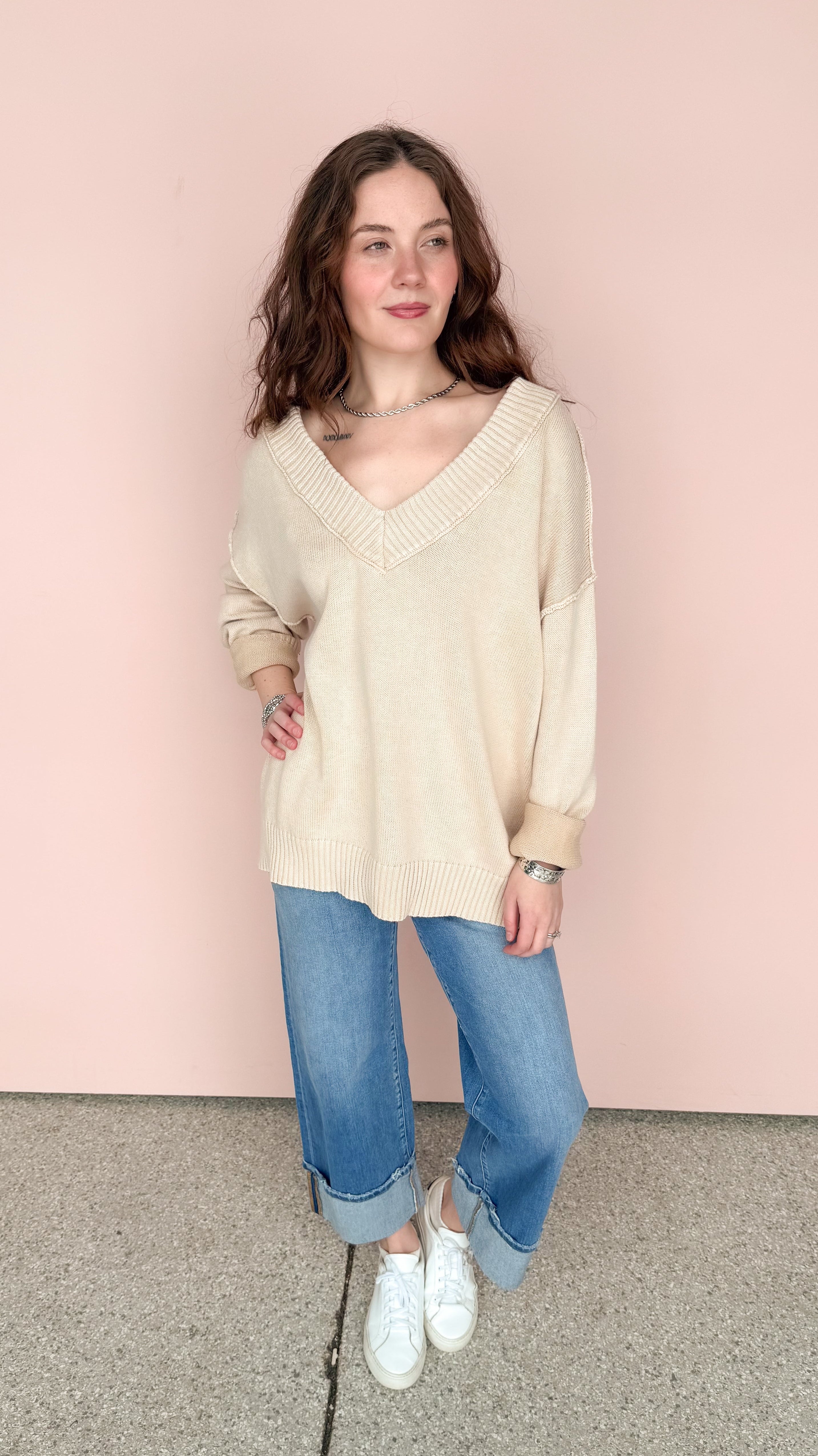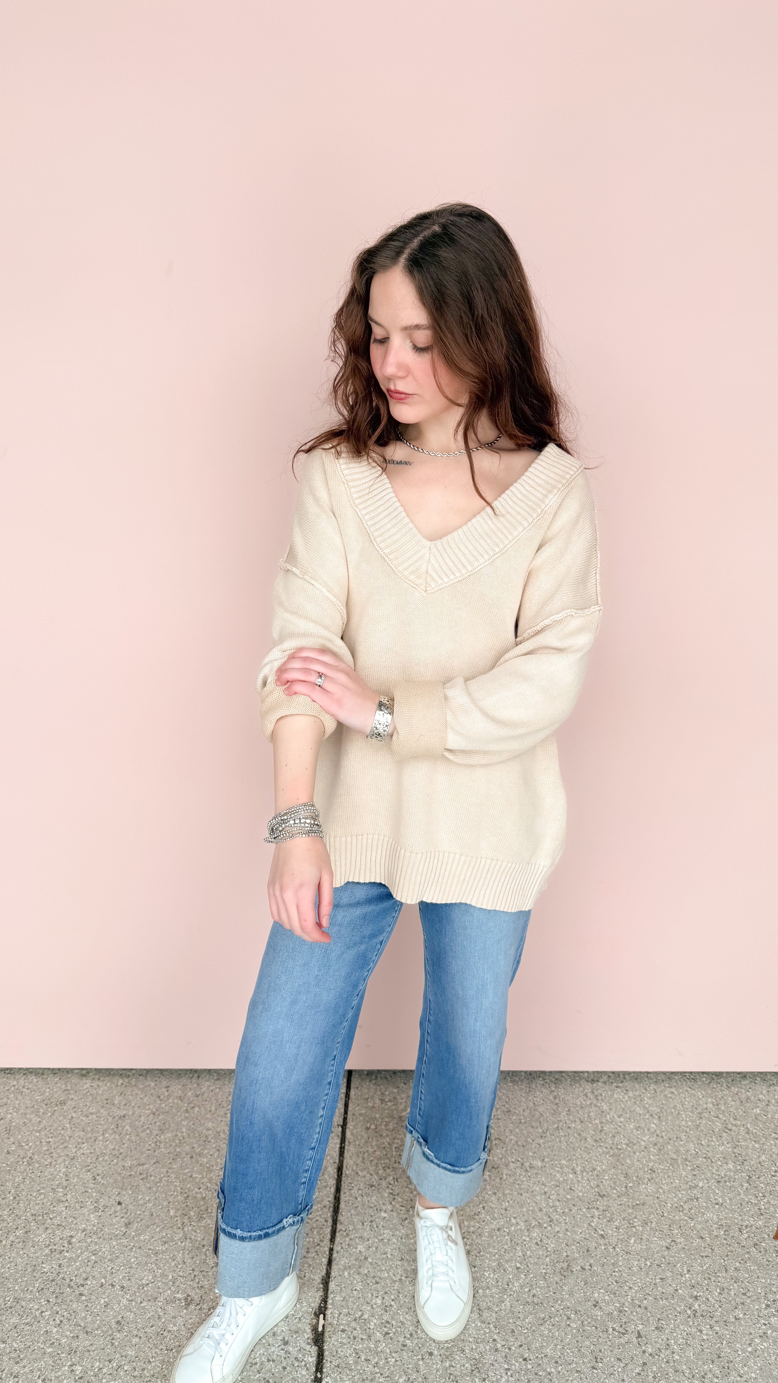 Meet your new favorite "always-on-rotation" layer. This buttery beige sweater is the definition of laid-back luxury, designed to feel like a warm hug whether you're out for coffee or curled up at home.