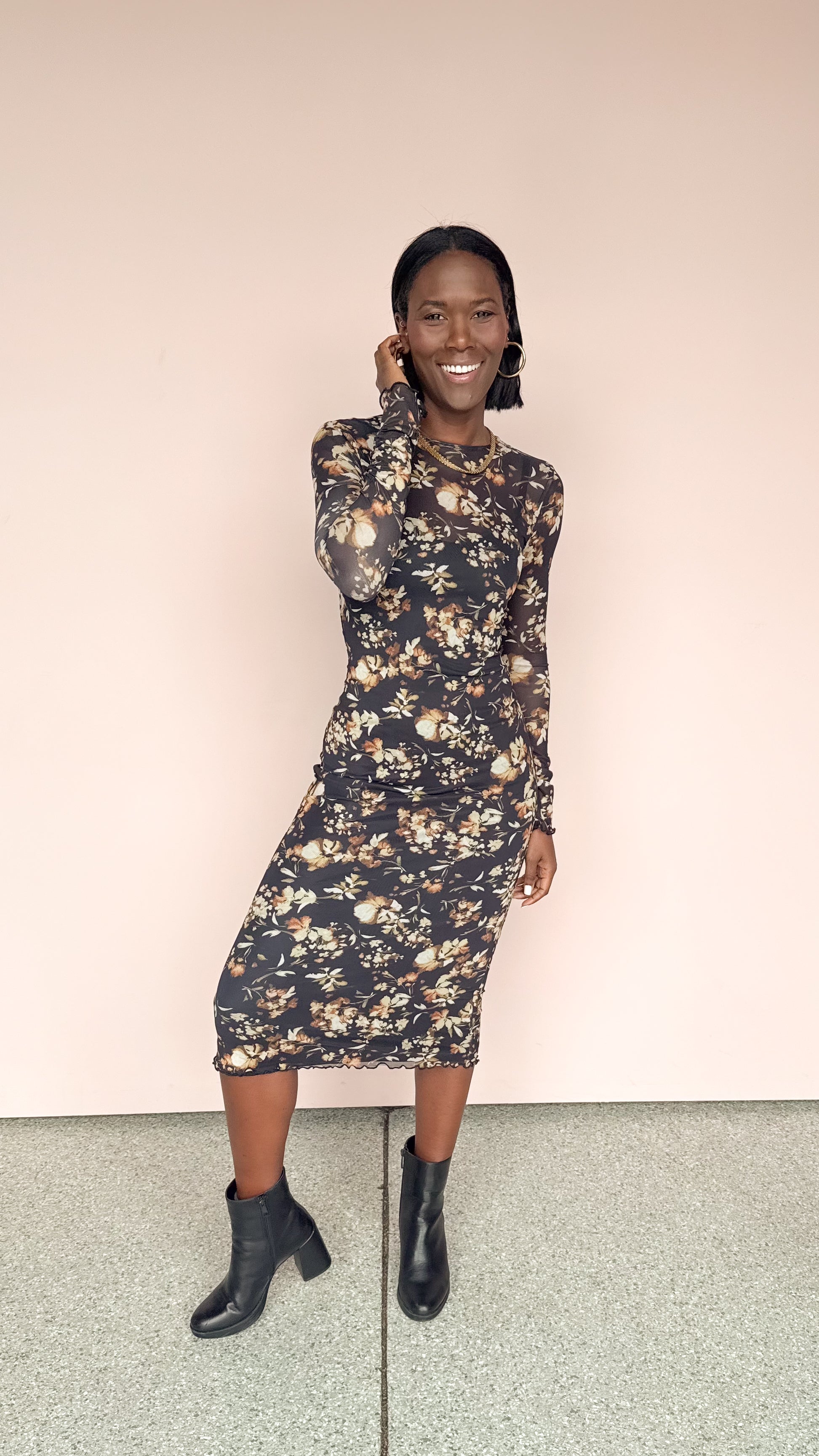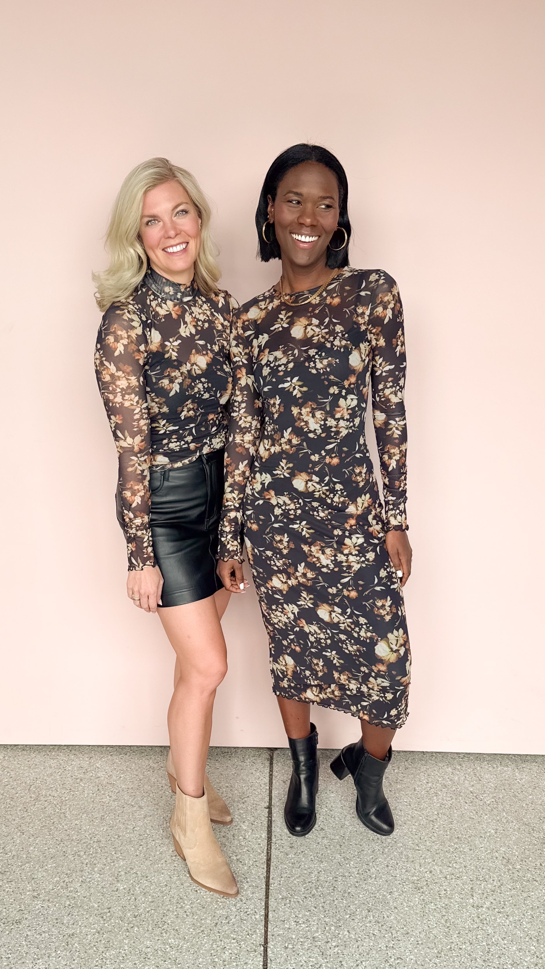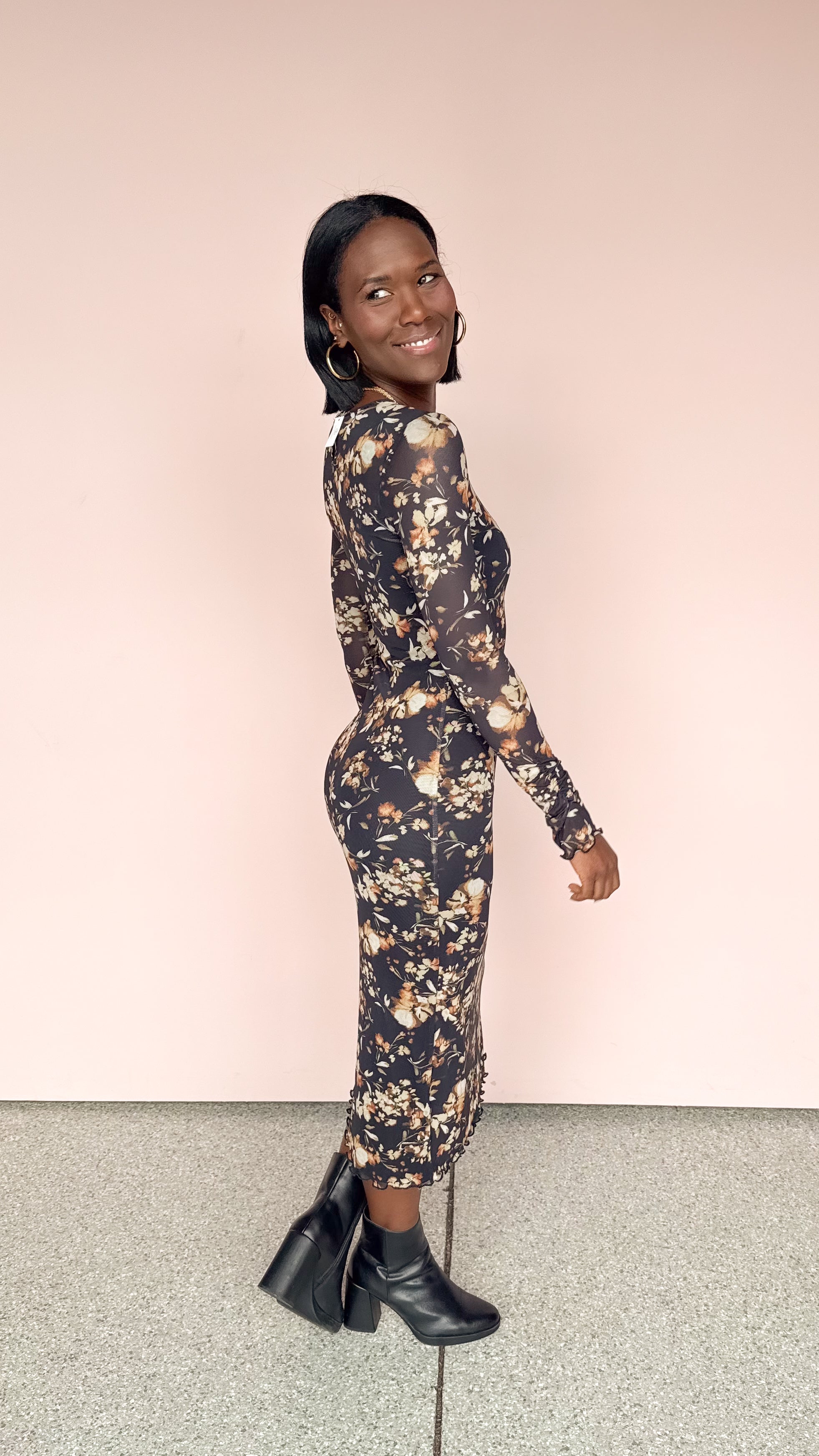 Get ready to blossom, even after dark! Our Moonlit Meadow Dress is a romantic dream come true, blending dark elegance with a playful floral fantasy.