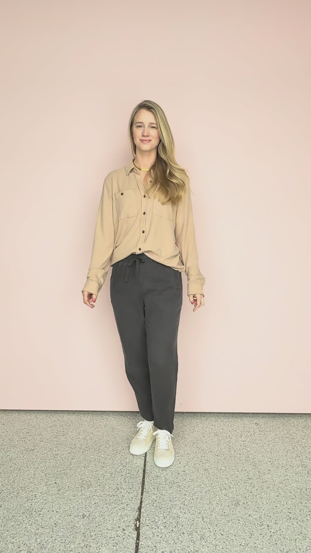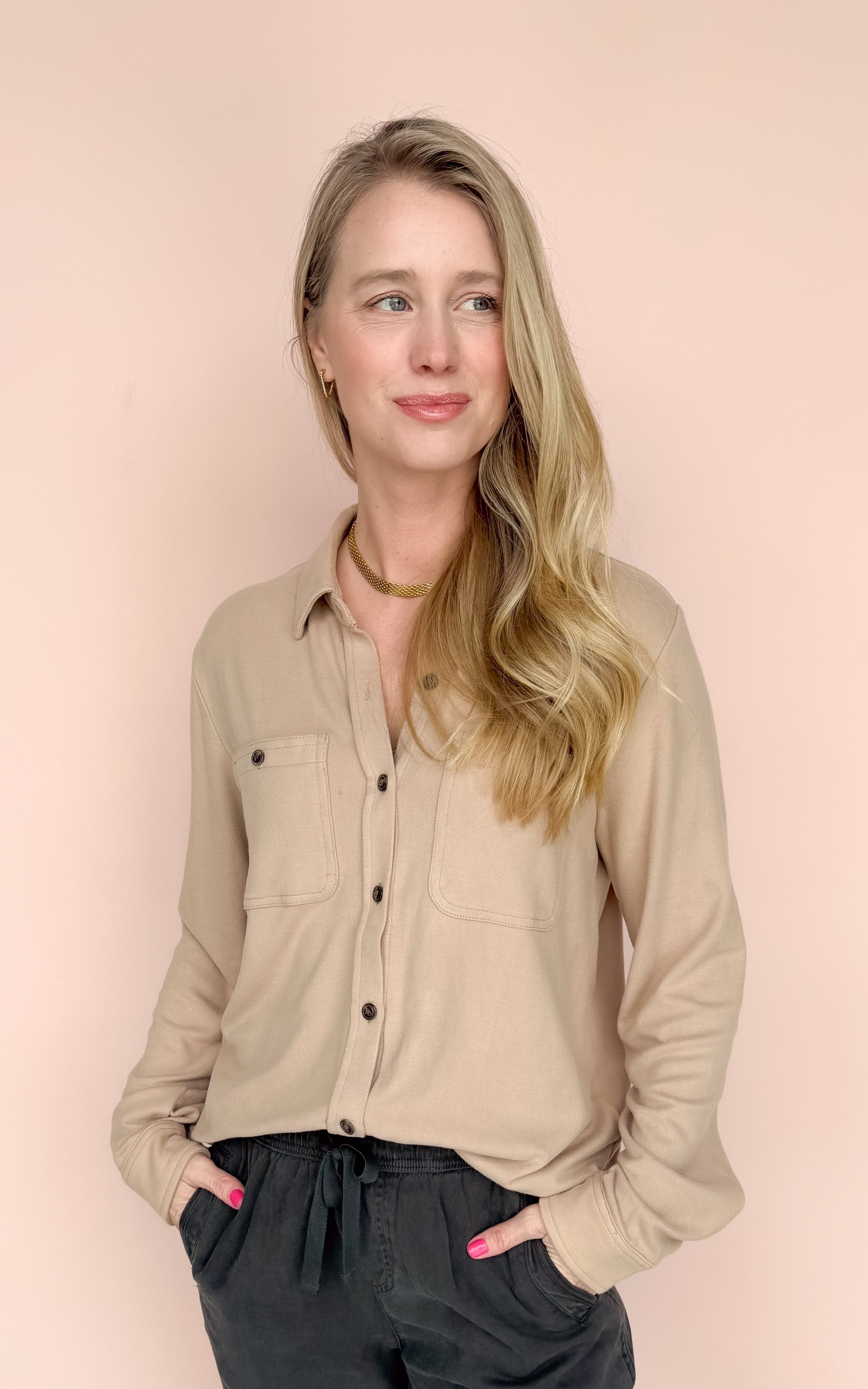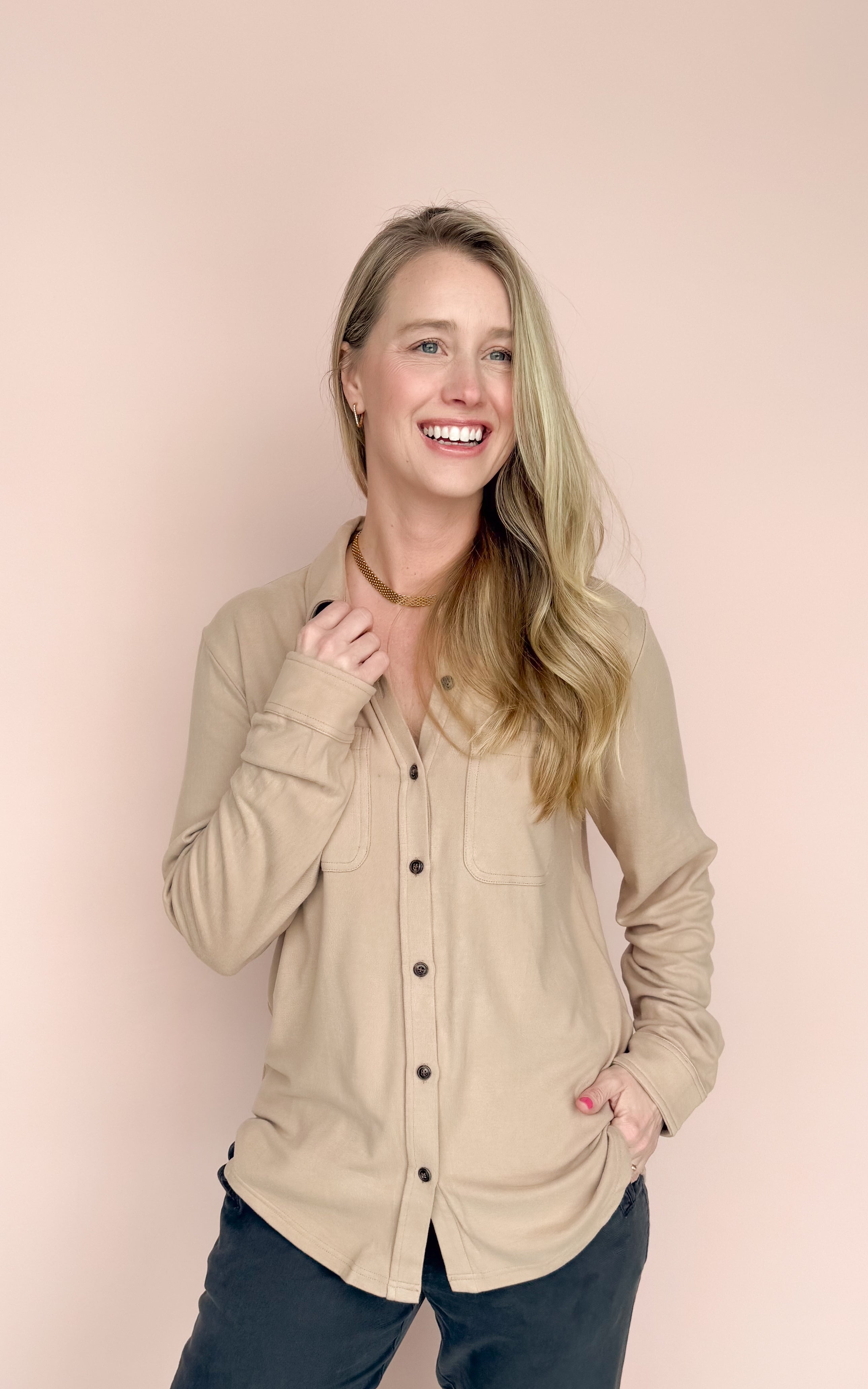 - Tan super soft button up top