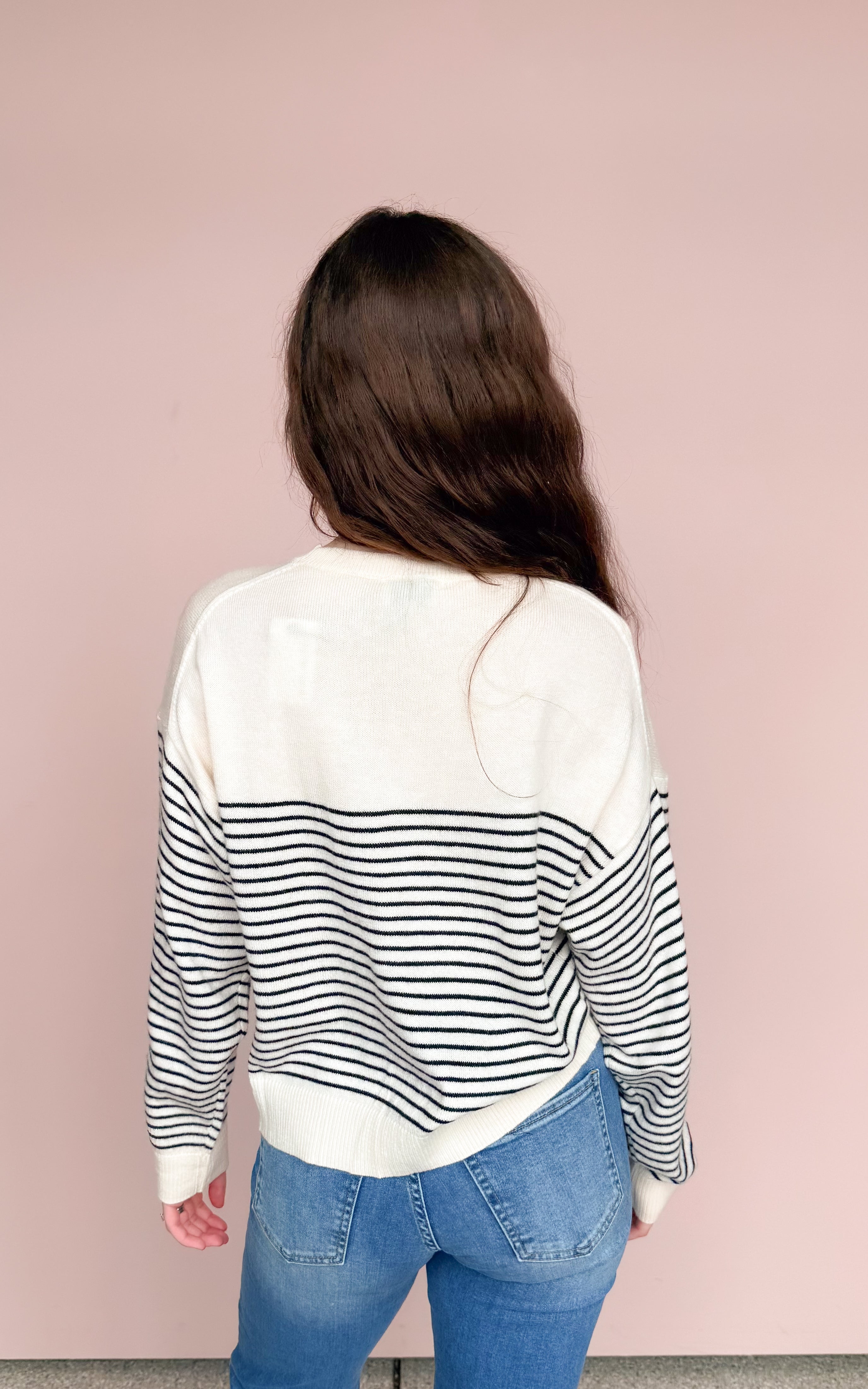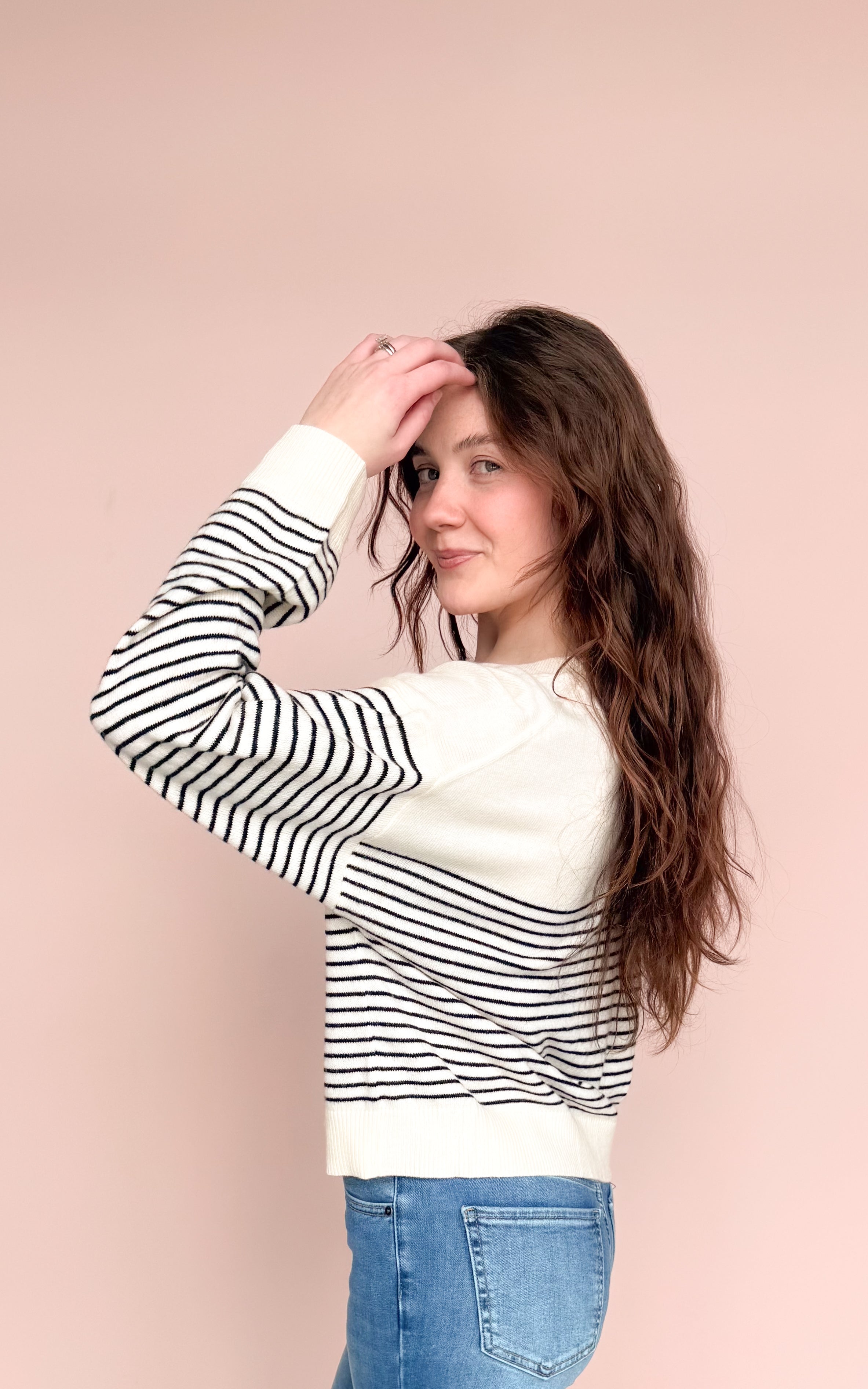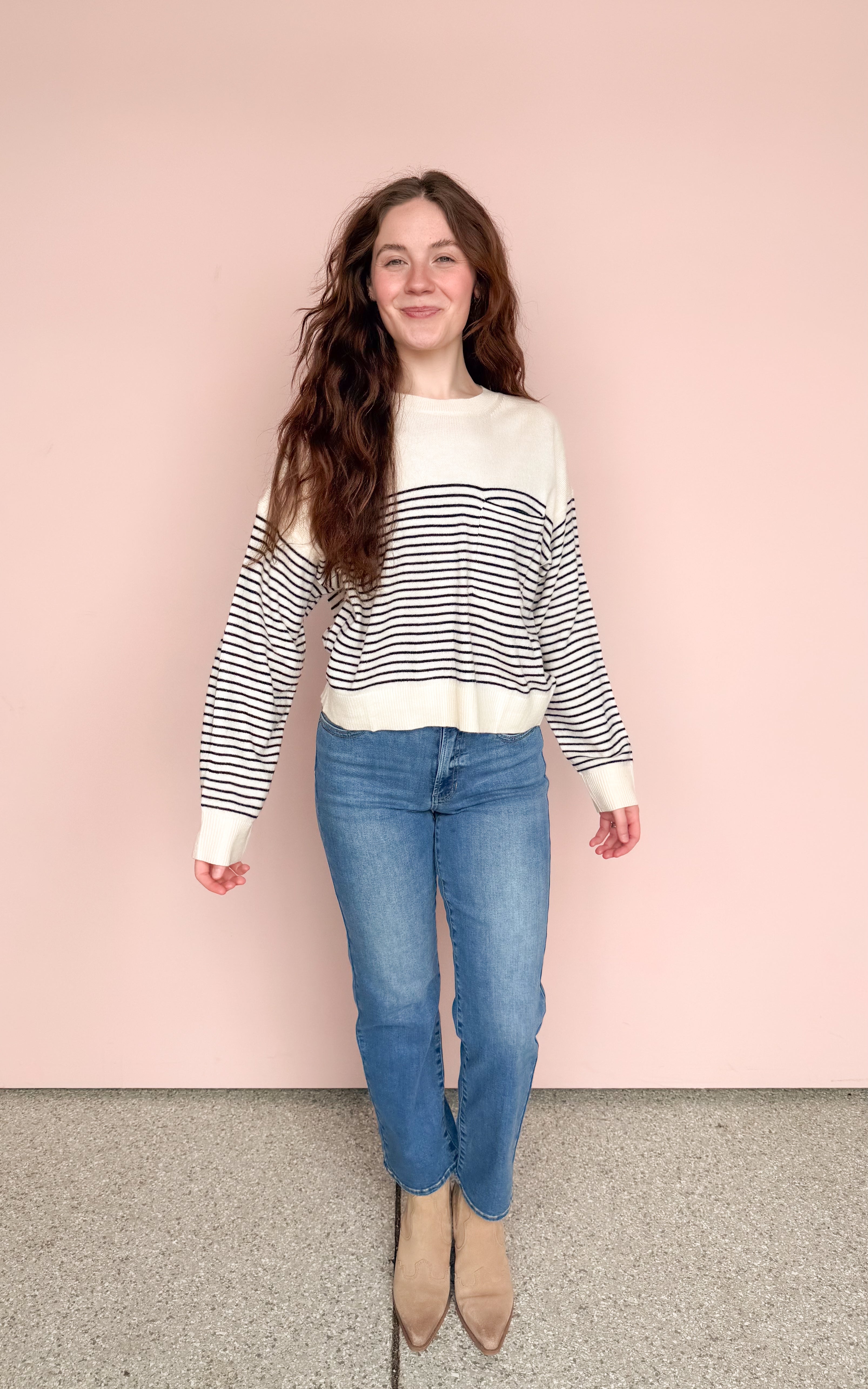 Lightweight stripe sweater perfect for warmer spring weather or layering in cooler temps.