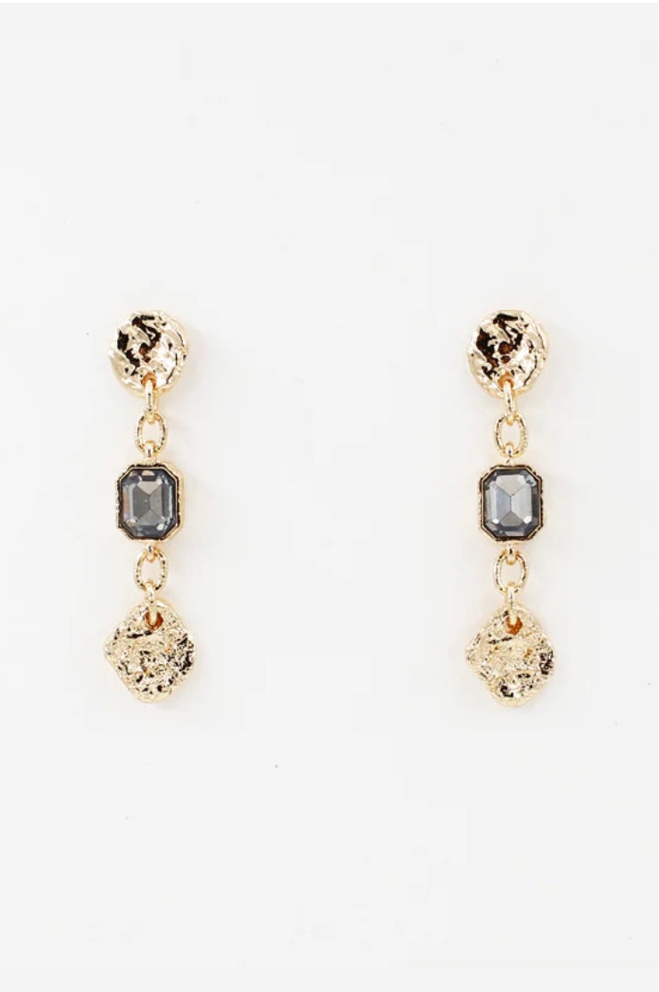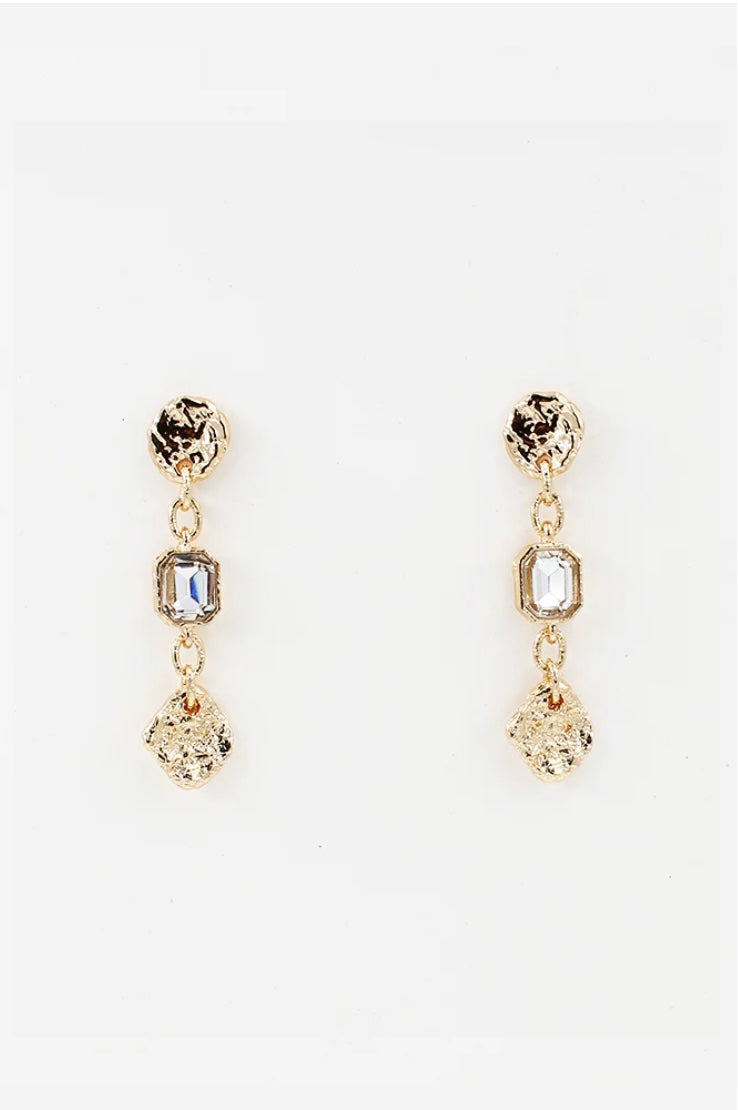 Effortless glam meets modern edge with these gold hammered drop earrings. The textured coin details pair beautifully with the faceted clear crystal centerpiece, creating a chic balance of shine and sophistication.