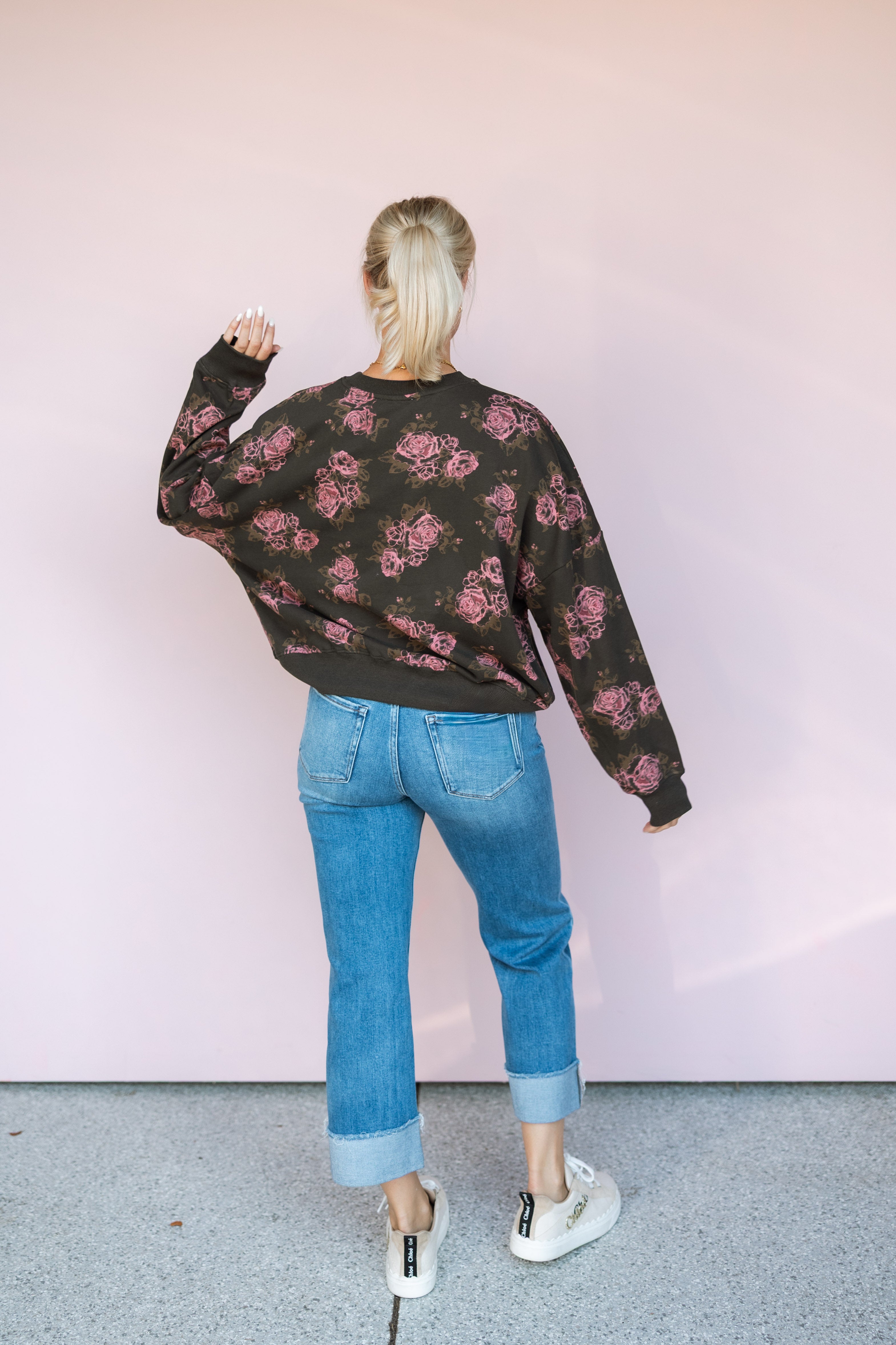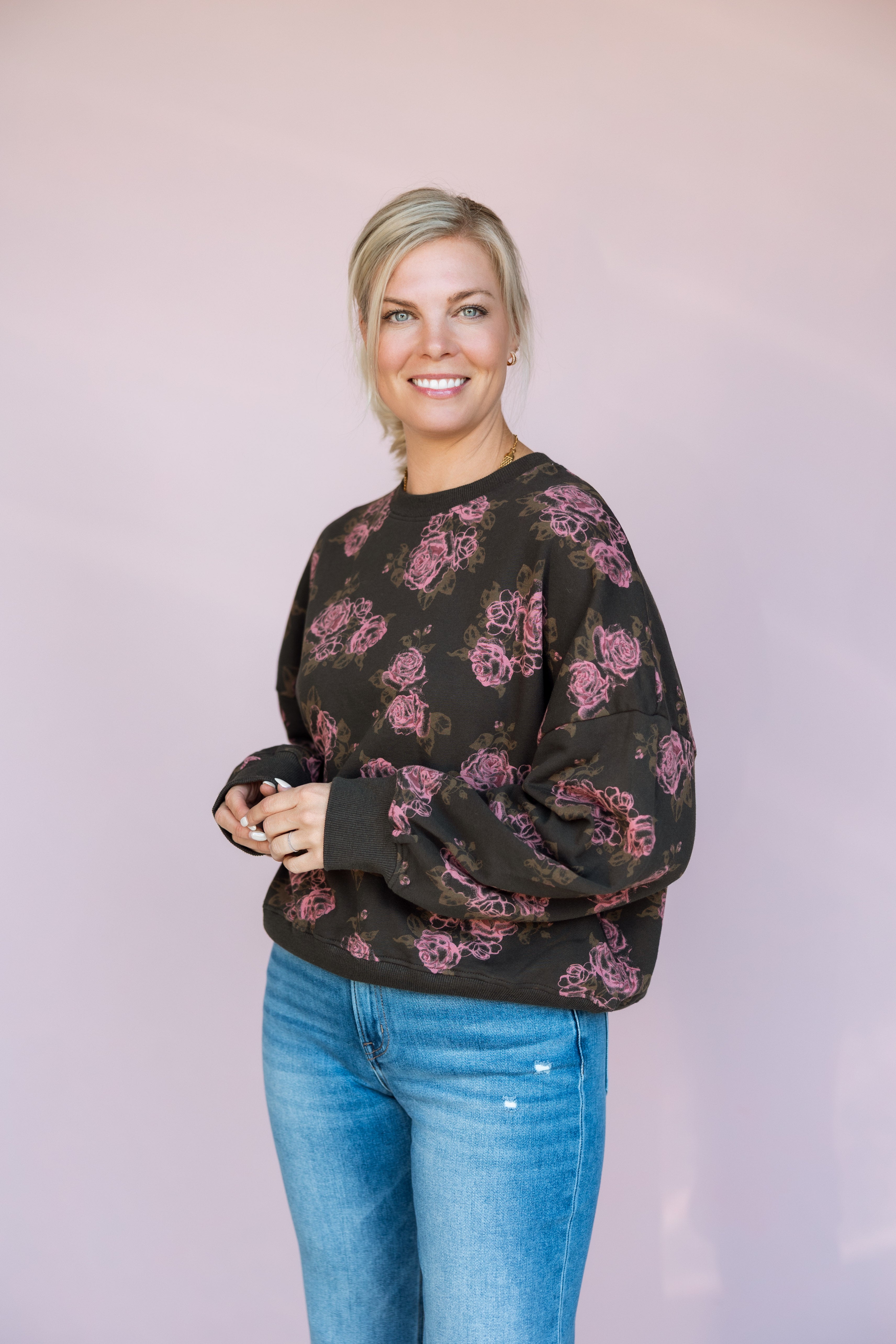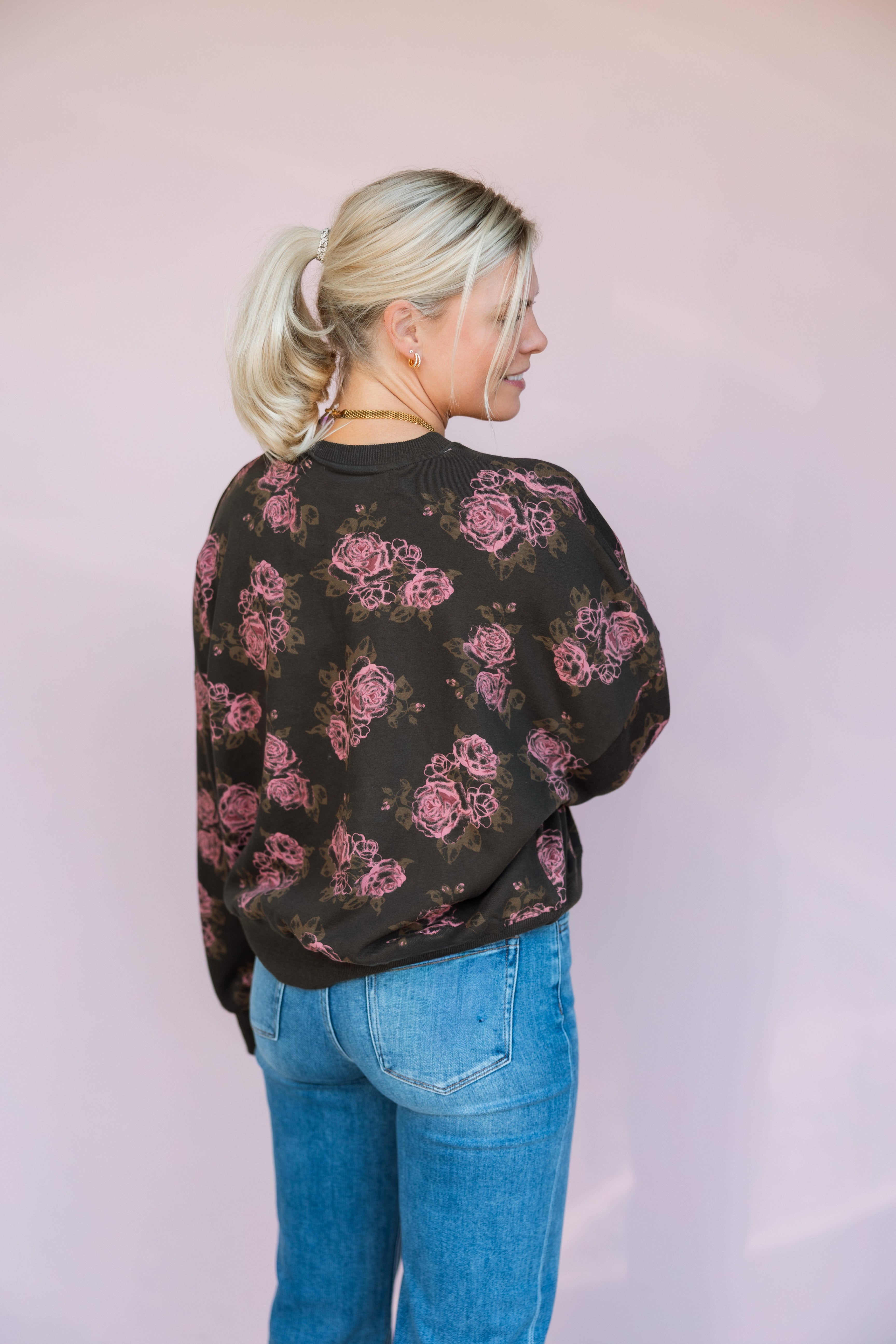 Our Hannah Sweatshirt blends the comfort of loungewear with a touch of romantic, moody floral style.
