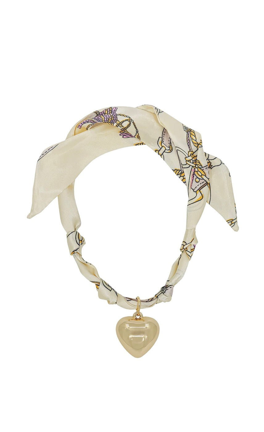 Chic and romantic, this knotted scarf necklace adds the perfect touch of personality to any outfit. The silky printed scarf ties effortlessly around your neck, accented by a gold hammered puffy heart charm for just the right amount of shine.