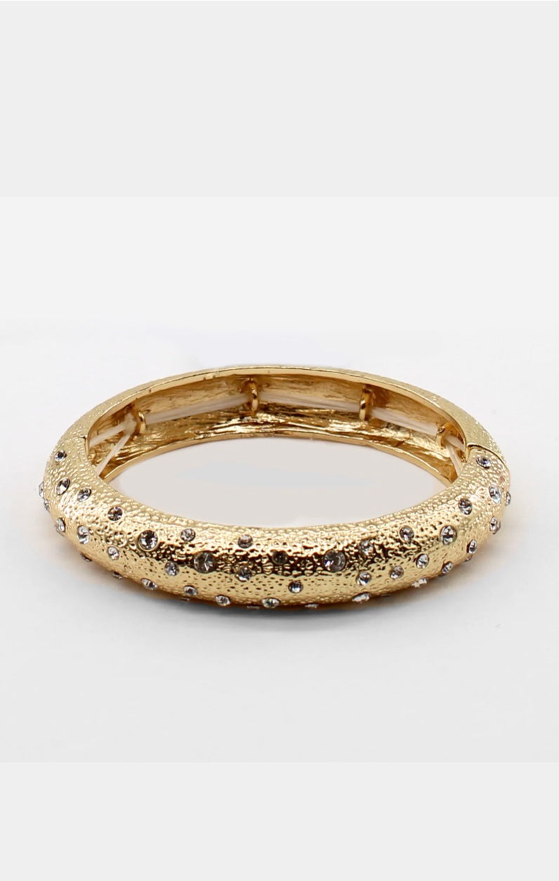 A little shimmer goes a long way — this gold stretch bracelet features a subtly textured finish and delicate rhinestone details that catch the light beautifully. Perfect for adding a touch of sparkle to your everyday look or stacking with other favorites for extra shine.